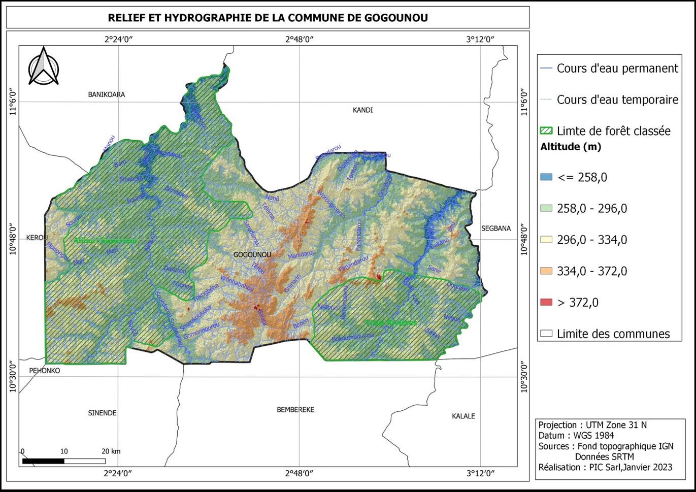 Le relief de la commune de Gogounou est très peu accidenté, dominé par des buttes de grès d’une altitude variant entre 200 à 300 m.